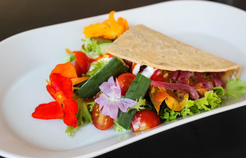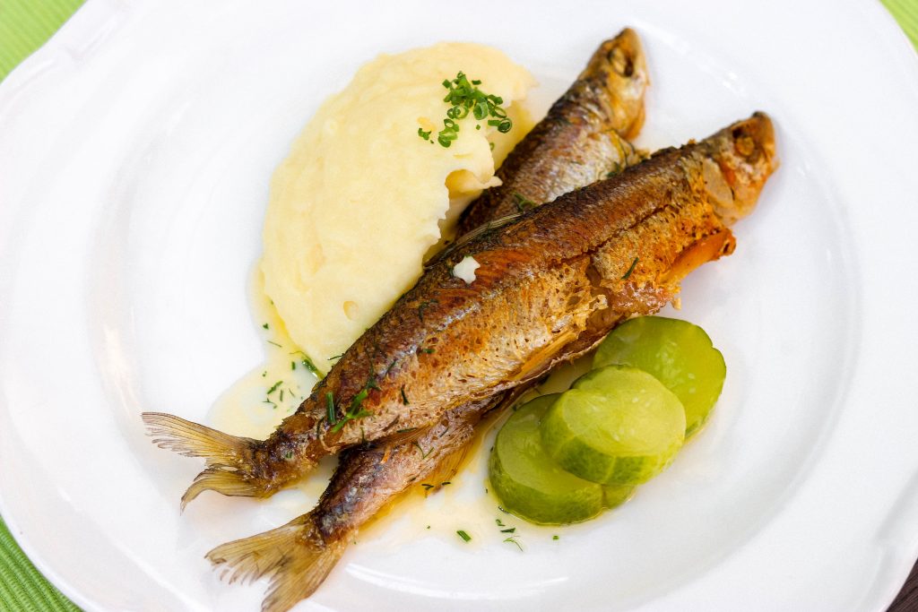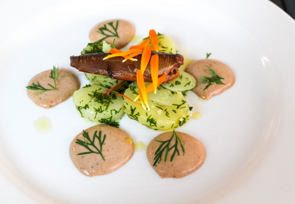 Lounasaikaankin tarjolla on jotain aivan muuta kuin linjastobuffetin kinkkukiusausta. Söimme alkupalaksi salaattia ja kylmää, hapokasta gazpachoa. Pääruoaksi valitsimme kalaa: muikkuja muusin kera sekä siikaa ja vihanneksia.