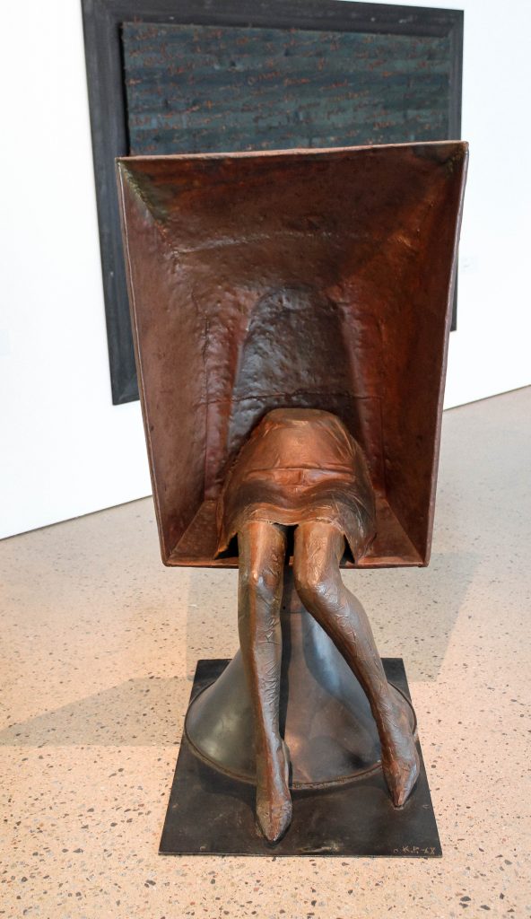Vaihtuvan kokoelman lisäksi kannattaa tutustua yläkerran Kimmo Pyykkö -näyttelyyn. Siellä on esimerkiksi Pyykön hauskoja muistilappuja kehystettyinä. Ja taas kerran, taiteilija-avioliitoista kiinnostunut kiinnitti huomionsa tähän Pyykön pronssiveistokseen, joka on Lahtisten kokoelmasta. Pronssiin on valettu hänen ex-vaimonsa, toimittaja Mirja Pyykön jalat!