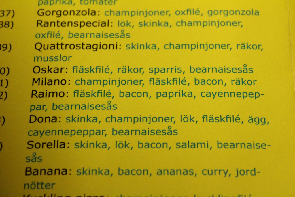 Ruotsissa käydessään kannattaa piipahtaa pizzeriassa jo ihan siksi, että näkee uskomattomat täytekombot. Olen nähnyt joidenkin suomalaisten pizzerioiden listoilla erikoisempia lättyjä, joiden täytteenä on bearnaisekastiketta tai hapankermaa. Nämä pizzat eivät ymmärtääkseni ole kuitenkaan kovin suosittuja. Tamperelaisessa Napolissakin erikoisemmat pizzat ovat omalla listallaan.