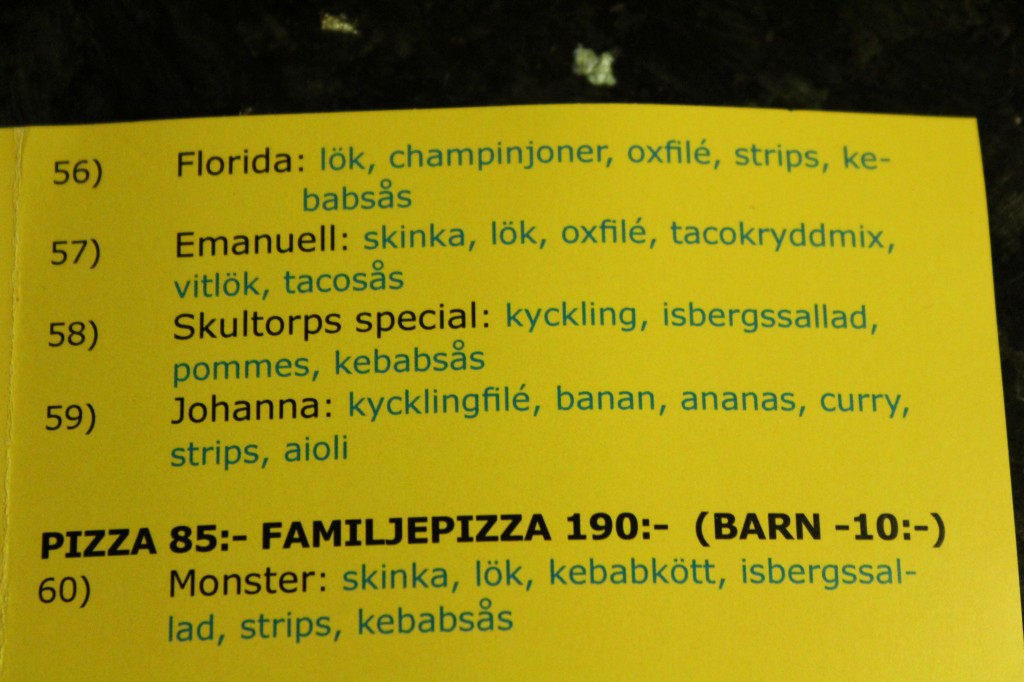Svenssonit kuitenkin rakastavat eksoottisia yhdistelmiä, ja niitä löytyy pienten lähipizzerioidenkin listoilta. Kuka sanoi, ettei pizzan päälle voisi laittaa banaania tai ananasta? Tai vaikka ranskanperunoita. Jep. Skövden läheisessä Mariestadissa erään pizzerian erikoisuus on ranskalaisilla ja hapankermalla päällystetty pizza. Bongasimme skövdeläisen lähipizzerian listalta talon erikoisuuden, joka on ranskanperunoilla ja kebabkastikkeella täytetty pizza.