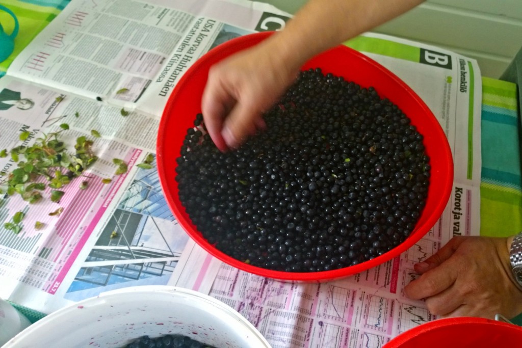 Saimme onneksi poimia rauhassa, ja taivas repesi vasta, kun olimme päässeet jo sisälle perkaamaan marjoja. Mutta metsässä tuntuu olevan sateisen kesän vuoksi nyt sellainen ikikosteus. Marhat eivät onneksi mössääntyneet, mutta perkaaminen oli vaikeaa. Lehtiä ja varvunpätkiä tuli poimurin mukana hiukan enemmän kuin käsipelillä. Marjat ja lehdet olivat niin kosteita, että pelkkä siivilöiminen ja ravistelu eivät riittäneet puhdistamaan saalista. Aika ison nyppimistyön teimme. Tai no, mies teki ja minä auoin vieressä päätäni ja join kahvia. Olin kovin huolissani siitä, että mustikkamehua oli imeytynyt vasemman käteni kynsien ranskalaiseen manikyyriin, kuka korvaa ja miksi kukaan ei järjestä tämän asian takia mielenosoitusta? Itse en tietenkään jaksa mitään järjestää, kunhan märisen ja ihmettelen.