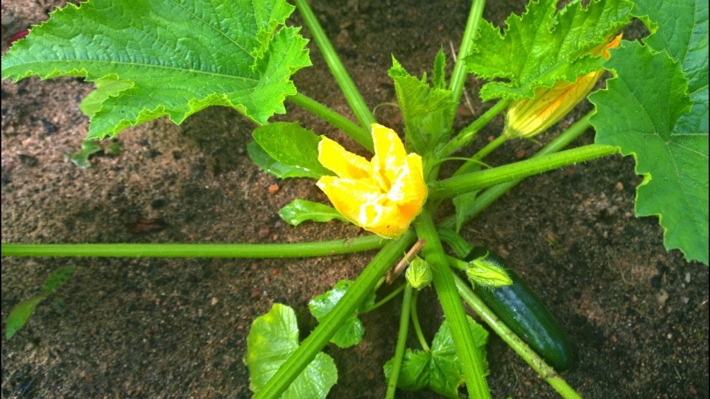 Olimme menettäneet toivomme kesäkurpitsan suhteen, mutta nyt sekin on piristynyt. Iloitsin kauniista kukista, sillä niistä voi saada pari täytettyä, uunissa muhinutta kesäkurpitsankukkaa kreikkalaiseen tyyliin. Ja kyllä sieltä puskee ihan oikeaa kurpitsaa lehtien alta.