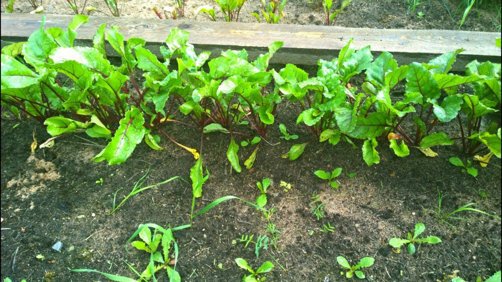 Tilanne ryytimaalla on nyt paljon valoisampi kuin reilu viikko sitten. Vaikka retiisit menetettiin, punajuuret ovat tykänneet harventamisesta ja kasvavat kauniisti. Nyt pidän sormia ja varpaita ristissä, että nämä saisivat olla tuholaisilta rauhassa. Ruohosipulikin on piristynyt. Kannatti nyppiä puumaisen varren kasvattaneet kukat pois. Tilalle on kasvanut taas raikasta, makeaa ja pehmeää sipulia. Tästähän syö koko loppukesän.