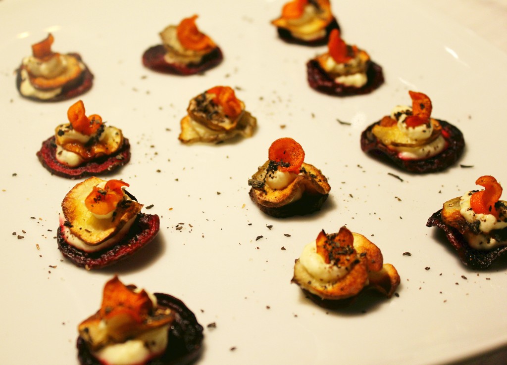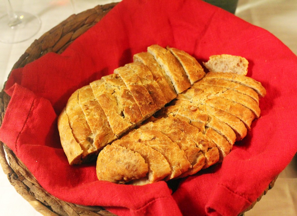 Katri ja Heikki painottivat ruoan ja viinin liiton tärkeyttä. Tämä ilta oli hyvä osoitus siitä, että viinejä kannattaa a.) maistella aina useampia kerrallaan ja tehdä vertailua sekä b.) kokeilla erilaisia ruoan ja viinin yhdistelmiä. Alkupalana maistelimme näitä mielettömän kauniita ja herkullisia paahdettuja juureslastuja omenamoussen kera. Heikki oli myös tehnyt itse leipää, jonka hän oli tehnyt omasta juuresta. Kuten sanottu, ei ravintolassakaan usein saa näin hyvää. Käsittämätöntä.