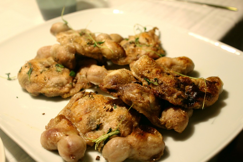 Varsinaisesta alkuruoasta vastasi Merja. Tarjolla oli viiriäistä syksyn viimeisten tryffeleiden kera. Yksinkertaisuudessaan upea annos, joka toimi hyvin kahden ensimmäisen viinin kanssa. Totesimme, että tämähän on niin klassinen vanhan maailman annos kuin vain olla voi. Merja osasi kypsentää viiriäisen täydellisesti. Tämä hentoinen lintu kärvennetään harmittavan usein kuivaksi, mutta koostumus oli nyt juuri sellainen kuin pitääkin. Rapea kuori ja unelmanpehmeä, nestettä tirskuva liha. Viiriäinen ei kaivannut mitään kikkailuja, vaan annos oli vahva juuri tällaisenaan.