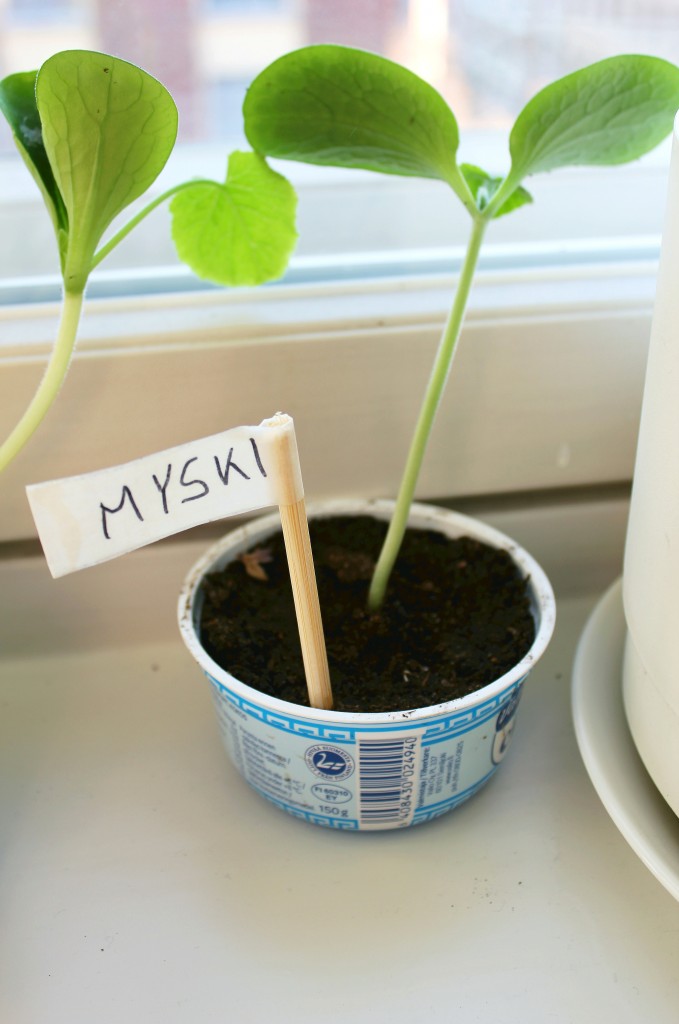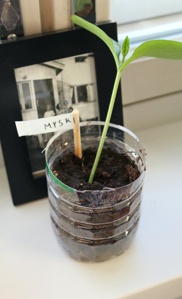 Kasvien kasvattaminen kasvattaa hauskalla tavalla myös lasta. Tyttäremme on ollut tänä vuonna aivan tohkeissaan kurpitsojen itämisestä. Hän haluaa tarkistaa taimipurkkien tilanteen joka päivä heti, kun palaa tarhasta ja astuu eteiseen. Kun ensimmäiset vihreät alkoivat itää, tyyppi selitti, että ”voi, sieltä tulee pieni vauva”. Taimille on myös annettu nimiä. Purkeista löytyvät äiti, isä, vauva ja Lukas. Älkää kysykö, miksi yhden nimi on Lukas, mutta muut ovat vain geneerisesti äitejä ja isejä. Tuskin koskaan saan tietää, tuskin koskaan ymmärrän.