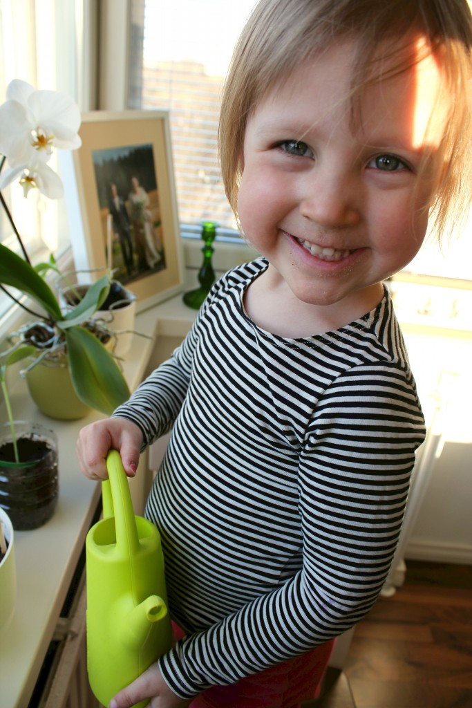 Muistan, että kukkien kastelu oli lapsena yksi lempihommistani. Pidin kovasti muistakin pienistä kotitöistä, kuten kenkätelineen järjestämisestä, pölyjen pyyhkimisestä ja pöydän kattamisesta. Taimien kastelu on 3-vuotiaamme jobi, joka tuntuu olevan hänelle suuri kunnia. Yllätyin huomatessani, miten varovasti ja nätisti lapsi kastelee taimet. Yksikään purkki ei ole vielä lainehtinut.
