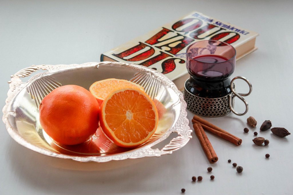 Yleensä keitän mehupohjaa miedolla lämmöllä kattilan alla kanelitangon, muutaman neilikan, maustepippurin, inkivääripalan ja appelsiininsiivujen kera. Joskus teen glögistä lämpimän boolin. Lopetettuani keittämisen lohkon kattilaan appelsiinia, omenaa tai päärynää.