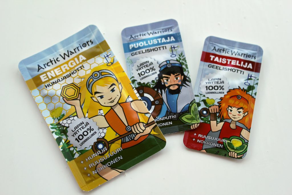Arctic Warriorsin hunajashotit on pakattu muovisiin yksittäispaketteihin. Paketti taitetaan keskeltä kahtia ja sisällön voi imaista suoraan paketista. Hunajashotteihin on lisätty ruusujuurta ja nokkosta. Mukana oli myös shotteja, joissa ei ole hunajaa, vaan kasvisglyserolia ja yrttejä, kuten nokkosta ja väinönputkea. Glyserolishotitkin ovat niin makeita, että voisin luulla niitä hunajapohjaisiksi. Valitettavasti nämä eivät nujertaneet sitkeää flunssaani. Nautin hunajat ja siirapit yksittäispakkausten sijaan mieluummin yhdestä purkista. Ihan kiva kokeilu, mutta en ostaisi.