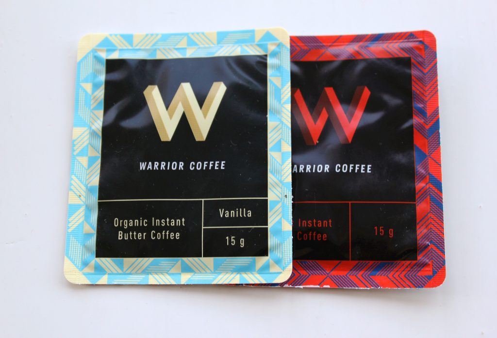 Paketin kiinnostavin tapaus oli Warrior Coffeen voikahvi. Kyseessä on siis yksittäispussiin pakattu pikakahvitiiviste. Tämä luomukahvi on höystetty kirkastetulla voilla ja ekstraneitsytkookosöljyllä. Yhdessä annoksessa on 118 kaloria. Kupillinen menee siis pienestä välipalasta. Rasvaa yhdessä annoksessa on 12 grammaa.