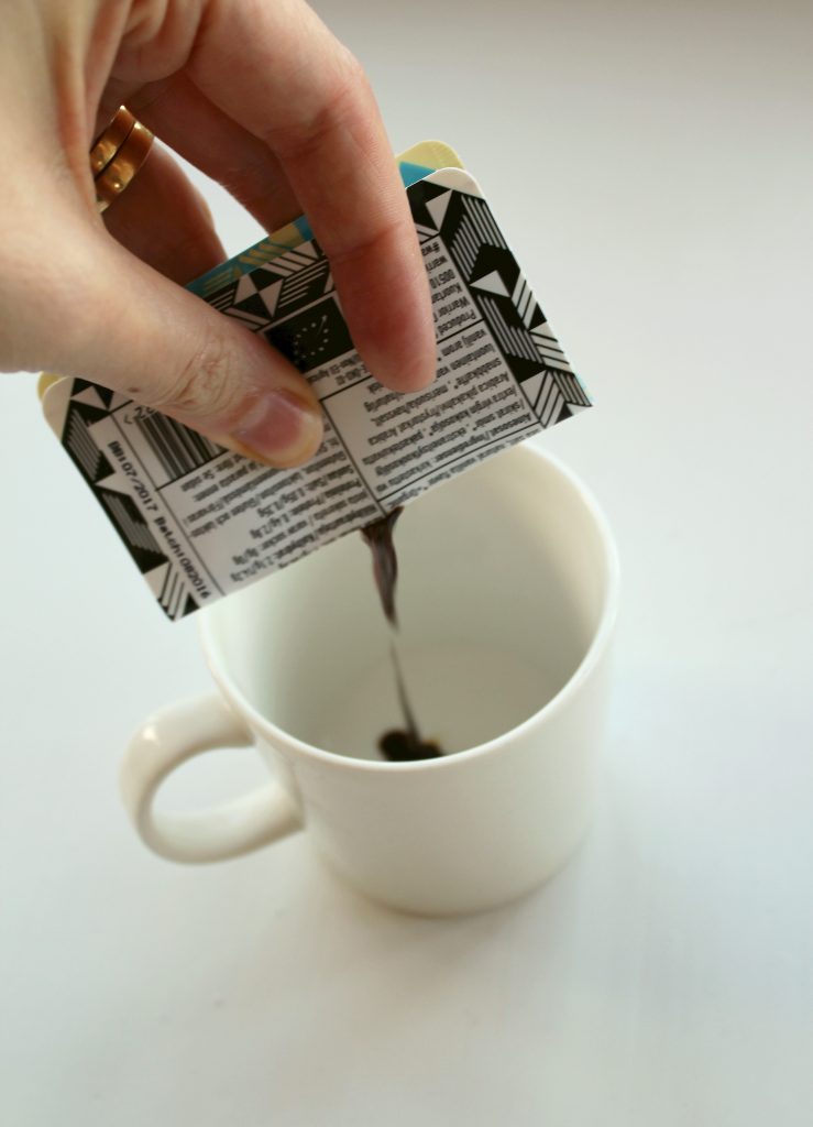 Testasin ensin vaniljalla maustetun kahvin. Paketti naksautetaan keskeltä poikki ja kahvitiiviste lorostellaan kuppiin. Sen päälle kaadetaan pari desiä kuumaa vettä, sekoitellaan ja nautitaan.
