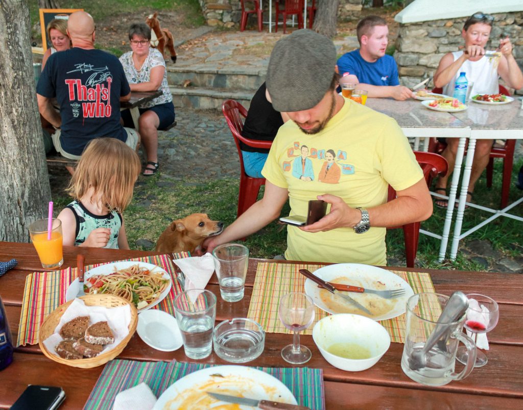 Ravintola sijaitsi perheen kotitalon puutarhassa, ja keittiö oli heidän oma keittiönsä. Perheellä oli myös lapsemme ikäinen poika ja ihana koira. Haukku tuli kerjäämään rapsutuksia, ja lasten välille syntyi lomaromanssi. Livahtivat yhdessä sisälle katsomaan piirrettyjä! Lähetimme pojalle joulukortin, ja tyttömme puhuu hänestä vieläkin.