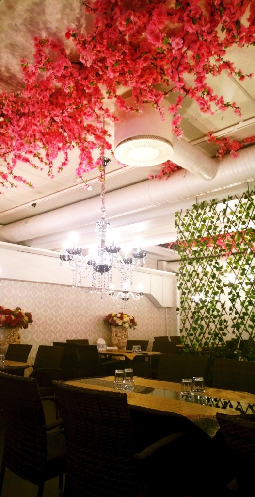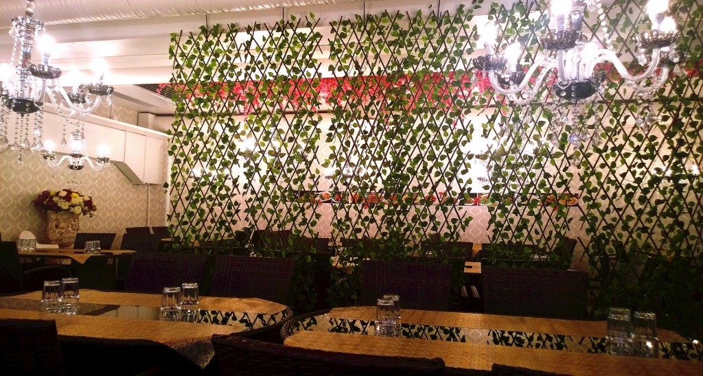 Pahoittelut myös kuvien laadusta. Ne eivät ole nyt kovin priimoja, koska olin liikkeellä pelkän Lumian kanssa. Lisäksi Yitongin sali on todella iso ja aika hämärä, vaikka katossa on näyttäviä kruunuja. Kuvista ilmenee myös, että ravintolan sisustaja tykkää kovasti kukista. Tämä on yksi syy siihen, miksi arvostelun kirjoittamisessa kesti. Ehdin nimittäin hetken luulla, että ravintola on lopettanut, mutta teippauksia ei ole poistettu ikkunoista. Kävelin pari kertaa paikan ohi hiljaiseen aikaan ja vilkaisin ikkunaa nopeasti. Tekokukkia ja koristepylväitä on niin paljon, että luulin kukkakaupan tulleen ravintolan tilalle.