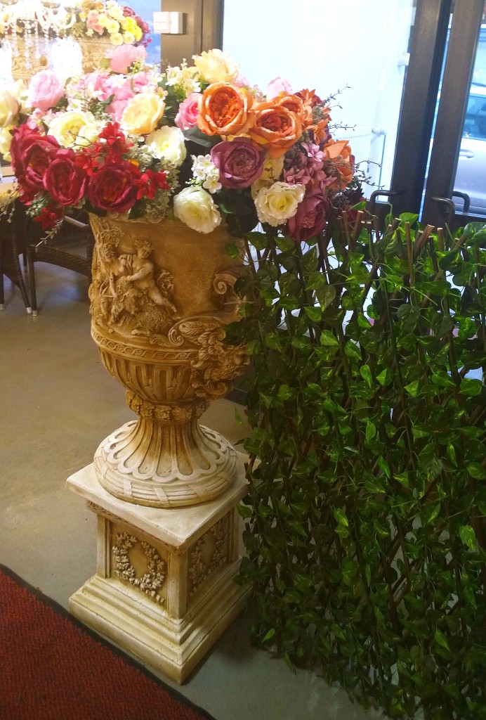 Oven edessä on pari valtavaa pylväsruukkua. En ymmärrä sijoittelun ideaa, sillä se vaikeuttaa ovista kulkemista. Ulkoapäin voi saada sen vaikutelman, että paikka on kiinni, ja ulkokoristeet on vain siirretty oven suuhun.