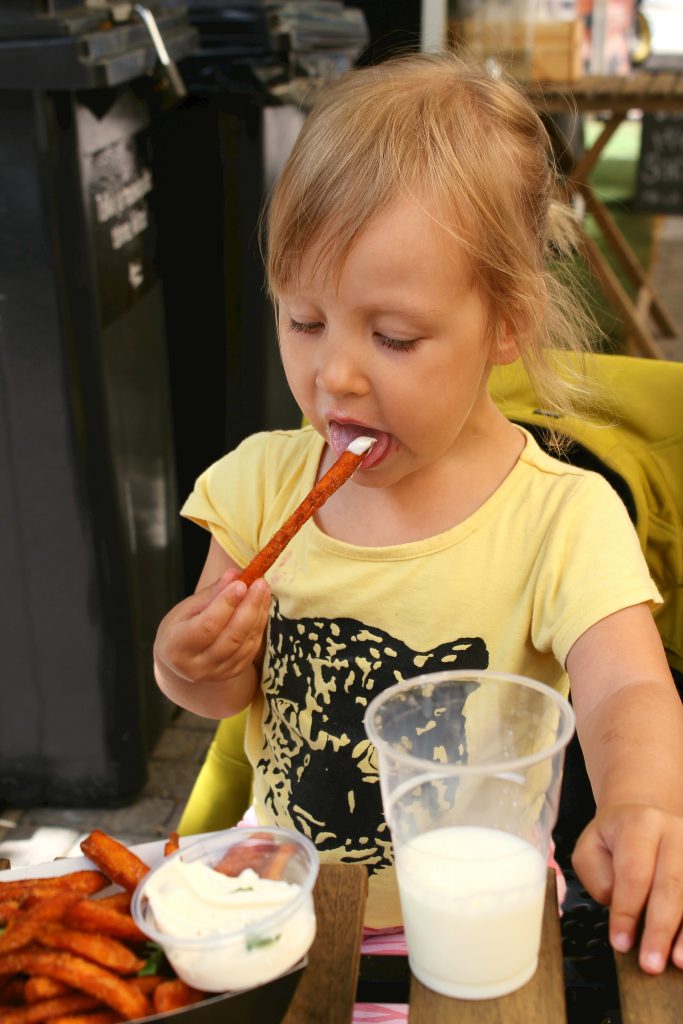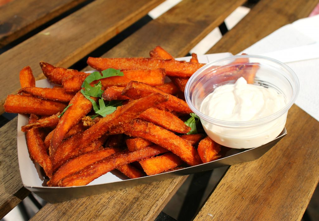 Myös majoneesidipin kera tarjoillut bataattiranskalaiset olivat herkulliset. Suolaa oli riittävästi, ja rakenteesta löytyi rapeutta, jota bataattiranuihin on vaikea saada. Tulimme tosin niin täyteen, että veimme suurimman osan lisukkeista folioon pakattuna kotiin.