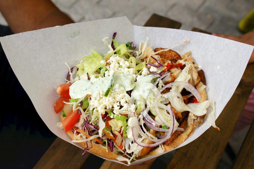 Nyt ruokien hinnat ovat nousseet hieman, mutta annoskokoon ja ruoan laatuun nähden ne ovat edelleen erittäin kilpailukykyiset. Kasviskebabin täytteenä oli viime vuonna uunijuureksia, jotka olivat kyllä hyviä, mutta kasvissyöjäkin kaipaa proteiinia. Nyt kasvisannos on entistä muhkeampi, sillä haudutettujen juuresten lisäksi täytteenä on falafelia.
