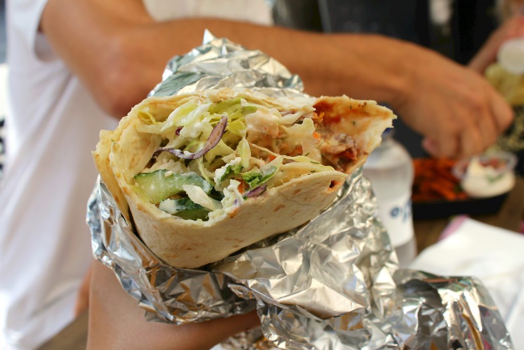 Kana-annoksessa on samat täytteet ja tietenkin broitsua falafelin sijaan. Broileri oli mukavan pehmeää, mikä on Suomessa aina iloinen yllätys – oli kyseessä sitten grilli tai illallisravintola. Paahdetuista kasviksista irtosi leipään hyvin kosteutta, ja jugurttikastiketta oli juuri sopiva määrä. Saimma syötyä molemmat annokset suht helposti sottaamatta itseämme.