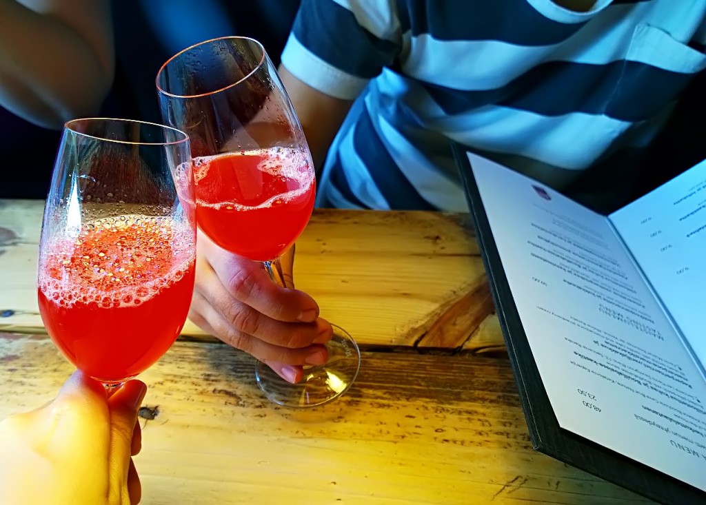 Aluksi halusimme kuitenkin kilistellä viikonlopulle. Kaveriporukalla liikenteessä ihan vain aikuisten kesken, jee! Pyysimme aperitiivisuositusta, ja tarjoilija vinkkasi talon omasta alkudrinkistä. Harmikseni sitä ei löydy viinilistalta, mutta muistelen, että drinkissä oli terävän lisäksi jotakin paikallista, kuohuvaa mesimarjajuomaa. Epäilin, onko juoma makuuni liian äitelä, sillä en pahemmin välitä makeista drinkeistä. Tarjoilija vakuutti, että juoma ei ole kovin makea, mutta kyllä se tälle hapannaamalle hiukan turhan sokerinen oli. Ehkä juoma olisi toiminut paremmin reilusti jäisenä, pidempänä ja enemmän blandattuna.
