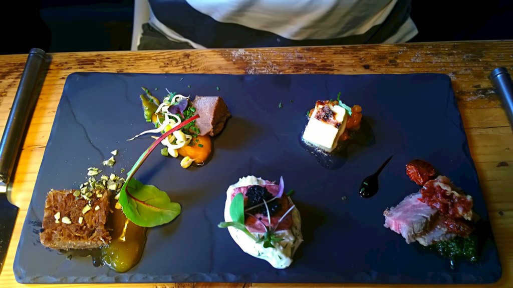 Yritän parhaani mukaan muistella, mitä kaikkea lajitelmassa oli. Katsokaas, kun kolmekymppinen saa kirmata viikonlopun anniskelualueella, muisti palailee vain pätkittäin.Valokuvan vasemmassa alareunassa on annos, joka oli muistaakseni prässättyä ankkaa. Annos jäi mieleeni positiivisena yllätyksenä. Liha oli todella mureaa ja maukasta, enkä ole syönyt siipikarjaa prässättynä. Lopputulos ei ollut kuiva ja tikkuinen, vaan sulava. Lisukehillokkeessa taisi olla aprikoosia, joka oli raikas yllätys iänikuisen mustaherukan sijaan. Kaikki lihat olivat mallikkaasti valmistettuja. Muistelen, että lajitelmassa oli myös nautaa ja porsasta. Vasemman yläkulman liha-annoksessa pidin eniten makeahkosta bataattipyreestä. Toisen punaisen lihan höysteenä oli makeanhappamia tomaatteja ja chimichurri-tyylistä yrttikastiketta. Edessä keskellä olevan, juuri sopivasti kypsytetyn lohen kanssa tarjottiin myös mätiä. Nam.