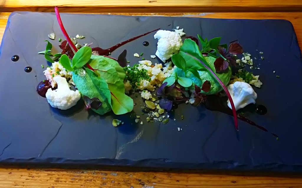 Himoitsemani nokkospannacotta oli odotuksen arvoinen. Rakenne tosin muistutti enemmän moussea kuin pannacottaa. Mausteita oli käytetty vain sen verran, että nokkosen hento maku korostui vienosti. Lisukkeena oli punajuuripyrettä, joka sopi nokkosen kaveriksi sekä visuaalisesti että makunsa puolesta. Kastikkeessa oli aito maan maku, ei taaskaan liikaa kikkailua tai maustamista. Annoksessa oli myös pikkelöityä ja paahdettua kukkakaalia. Kaali toi annokseen kaivattua rapsakkuutta ja pureksittavaa. Pikkelöity kukkakaali oli annoksen voimakkain, sopivan terävä maku. Paahdettuun kukkakaaliin olisin kaivannut enemmän suolaa ja paistopintaa.