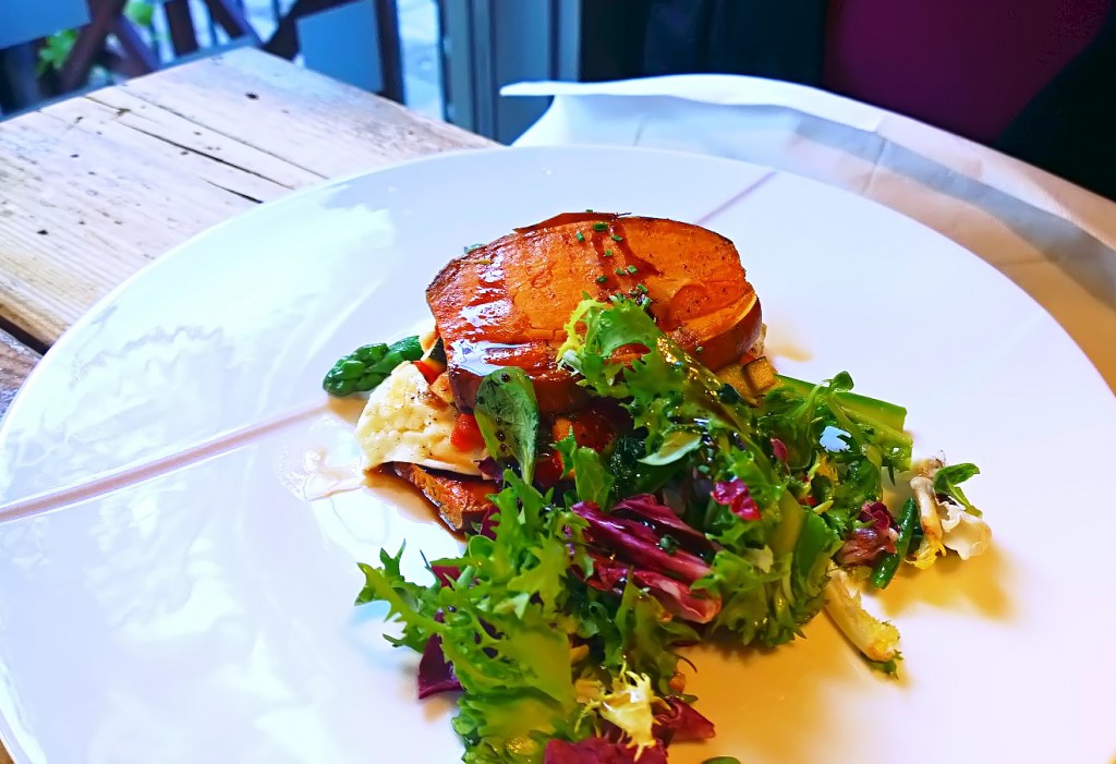 Nälkäisinä napsimme alkupalat vähän turhankin nopeaan tahtiin, vaikka yritin himmailla ja keskittyä makuihin. Lajitelma oli kaunis, lihat hyvin valmistettuja ja makuparit kekseliäitä, mutta eivät väkisin väännetyn erikoisia. Ainoastaan lakkahillon kanssa tarjottu leipäjuusto oli aika tylsä. Juustolle olisi voinut keksiä hiukan erikoisemman, sesongin mukaisen lisukkeen. Esimerkiksi mansikasta olisi voinut viritellä jotakin.