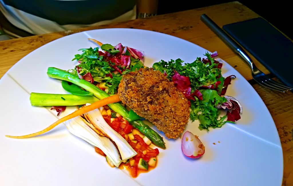 Tämä annos sai minut aika mietteliääksi. Vasikka on niin pehmeän makuinen, että friteeraus peitti aromin. Rapean kuoren ja unelmanpehmeän lihan yhdistelmä oli kutkuttava. Vasikka oli kuitenkin hennosti suolattua, ja se olisi kaivannut jotakin ärhäkämpää. Vihannessalsa ei aivan yltänyt tahdittamaan lihaa. Sekä minä että mies totesimme, että tämäkin annos olisi kaivannut täyteläisyyttä. Siis ihan rehtiä rasvaa ja hiilihydraatteja, ei liioitellusti, mutta hiukan. Ehkä friteerausta on haluttu tasapainottaa todella puhtailla ja keveillä kasviksilla, mutta joku yhdistävä silta jäi nyt puuttumaan lihan ja lisukkeiden väliltä. (Ei jumalauta, alan kuulostaa ihan Jorma Uotiselta, anteeksi.)