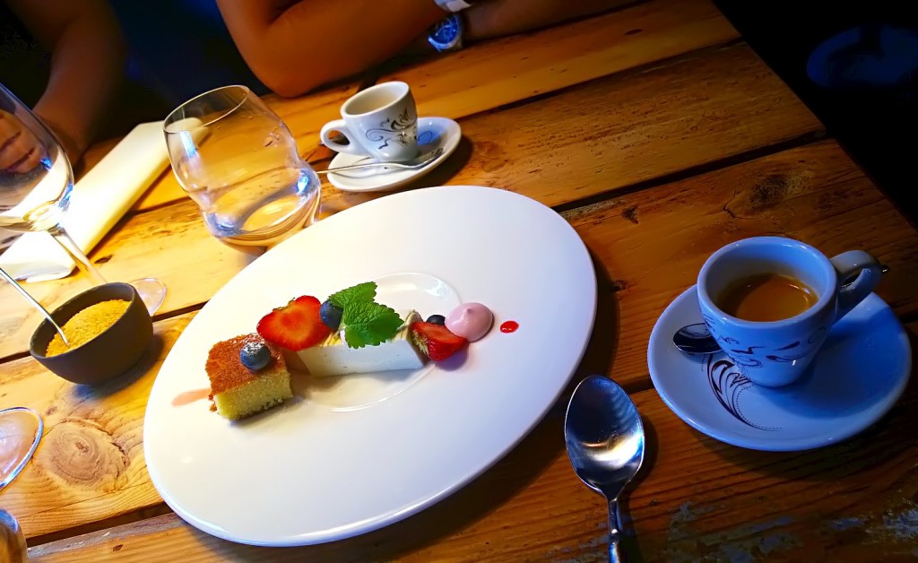 Vaikka kala-annos oli todella iso, jäi jälkiruokavatsaan vielä tilaa. Elimistöni ei saa rauhaa, jos sen sokeri- ja rasvatasapainoa häiritään liian terveellisellä ruoalla. Tilasimme miehen kanssa puoliksi raparperiterriiniä, vaniljakakkua ja mansikka-mascarponecremeä (9 e). Tässä vaiheessa tunnelma alkoi olla sen verran iloinen, että en uskalla enää vannoa, minkä jälkiruokaviinin valitsimme – portia se ei ainakaan ollut. Joka tapauksessa jotakin huumaavan paksua, voimakkaasti mustaherukanlehdille tuoksuvaa ja tyylikästä.
