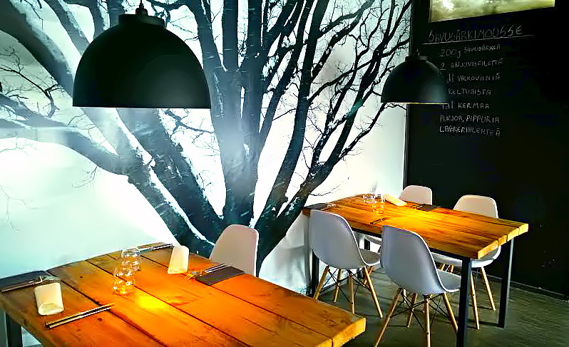 Kielo sijaitsee aivan Joensuun keskustan kupeessa Suvantokadulla. Olisin kuitenkin kävellyt ravintolan ohi ellen olisi tiennyt mitä etsin. Rakennus on aika karu betonibunkkeri, mutta kun astuu sisälle, astuu kirjaimellisesti toiseen maailmaan. Sisustuksessa on hyödynnetty vaaleaa puuta ja koivutapetteja, ja tyyli on samaan aikaan persoonallinen ja sopivan pelkistetty. Seinällä olevalla liitutaululla paljastetaan keittiön reseptejä, eli siitä vain testaamaan kotikeittiössä savusärkimoussea.