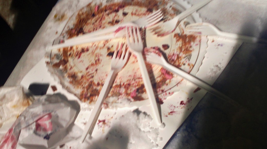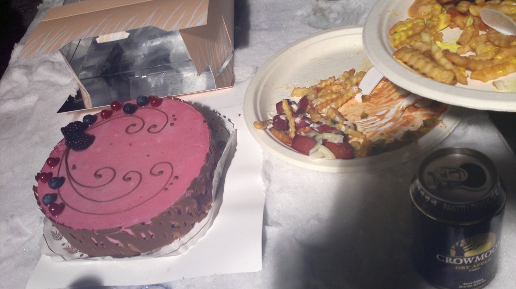 Orgastinen ruokakokemus sai meidät villiintymään. Syntymäpäiväsankari muisti, että autossa oli yksi kokonainen kakku, joka jäi yli Telakan juhlavastaanotolta. Ystävällinen grillin täti antoi meille puhtaita haarukoita. Korkkasimme Pyynikin ammattiopiston kondiittoriopiskelijoiden loihtiman suklaa-mustaviinimarjakakun lumisen roskiksen päällä. Kakku oli mainio. Suklaakerros oli täyteläinen eikä liian makea. Viinimarjaa oli kahdessa kerroksessa miedompana ja voimakkaampana. Loistava yhdistelmä, joka maistui niillekin, jotka eivät ole pahemmin makean perään.