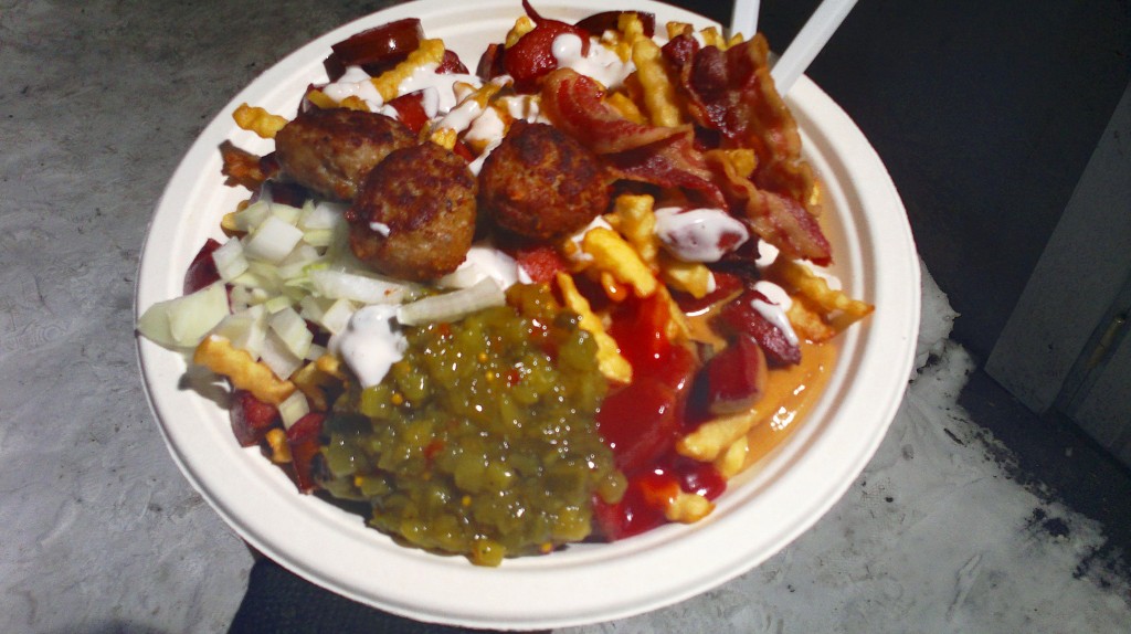 Kuningasannos oli ehdottomasti nälkäisimpien tilaama Sitä sun tätä (8 e). Annoksessa oli lihapullia, ranskalaisia, uppopaistettua makkaraa ja pekonia. Annoksen mittasuhteet eivät ehkä pääse kuvassa oikeuksiinsa. Lautanen oli valtava. Kaksi nälkäistä tulisi siitä helposti kylläiseksi.