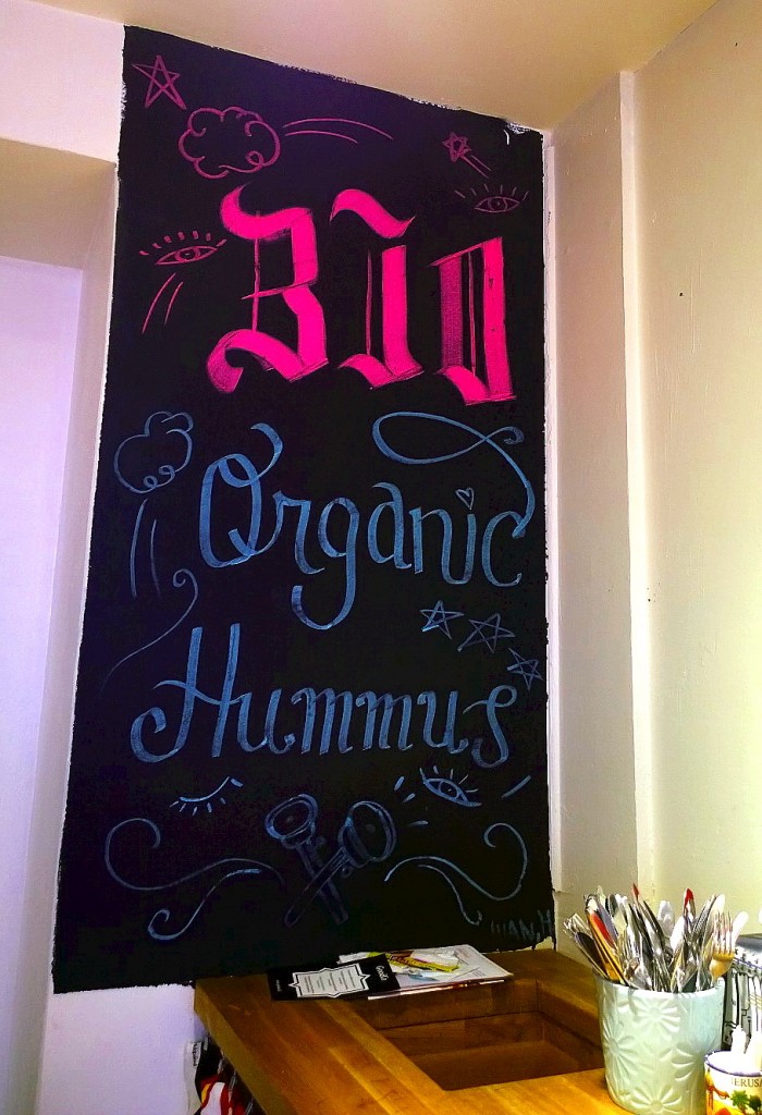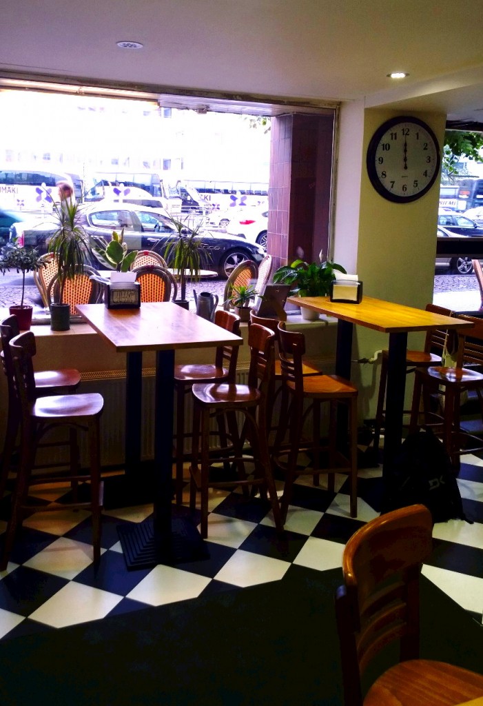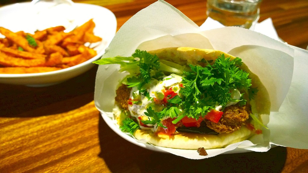 Söimme pitat falafelilla, paahdetulla munakoisolla ja fetalla (8,9 e). Uhmasin ähkyä ja tilasin vielä ihanan näköiset bataattiranskalaiset tsatsikilla (4,9 e). Limellä maustettua vettä saa ilmaiseksi, ja tarjolla on ihania erikoislimppareita. Pita-annos oli aivan mieletön. En ole koskaan saanut Suomessa näin hyvää falafelia. Korjaan: niillä kebsuloiden mauttomilla keltaisilla jauhopuikoilla ei ole mitään tekemistä sen kanssa, mitä söin tänään. Annos oli iso ja mehevä. Pita oli napakka ja pehmentyi kastikkeista sopivasti, ei kuitenkaan vetiseksi. Kastikkeet olivat raikkaita ja mausteisia, munakoiso kaviaarimaisen suolaista ja ekstra-lisukkeena tarjottu chili tuoretta. Ja ihan hiton potkivaa. Onneksi sitä ei ollut liikaa.