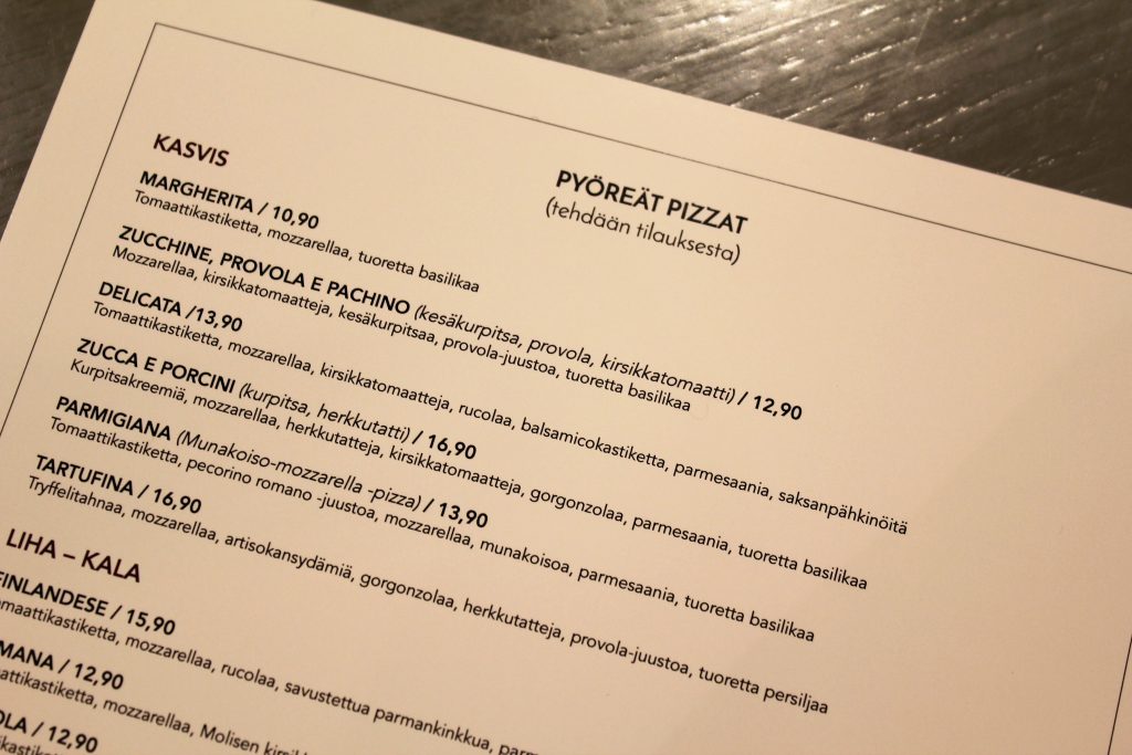 Aloitimme illan muutamalla levypizzapalalla, jonka jälkeen valitsimme listalta pyöreitä pizzoja. Pyöreät pizzat valmistetaan siis tilauksesta, eikä niitä ole valmiina tiskissä. Hintataso on samaa luokkaa kuin Sitkossa ja muissa paremmissa pizzerioissa. Halvimmat pizzat maksavat reilun kympin, kalleimmat 16,90 euroa.