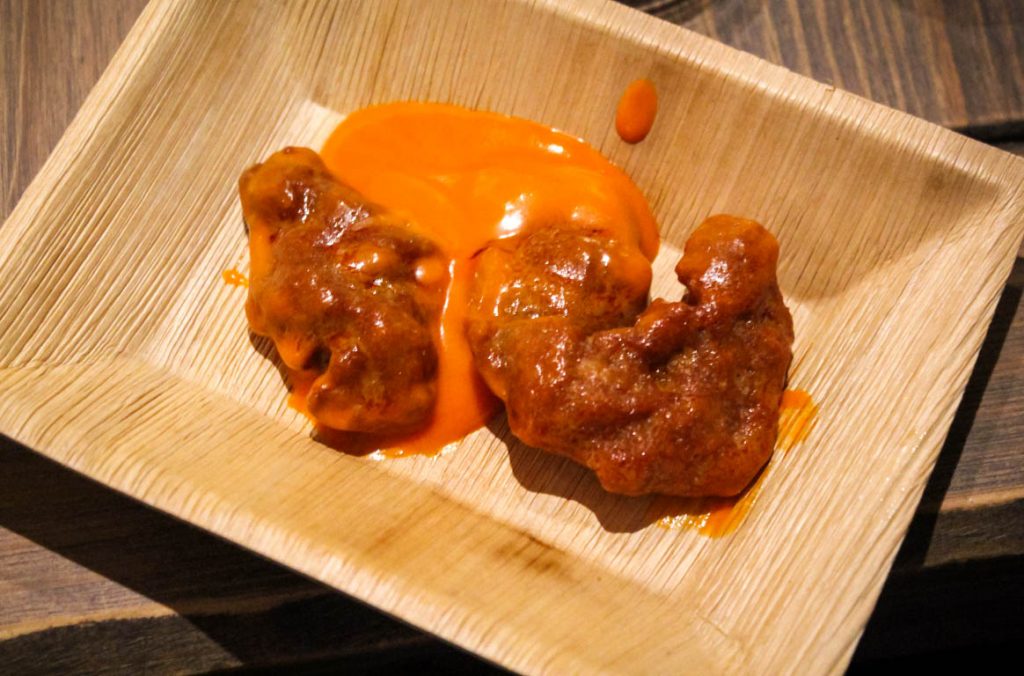 Seitansiivet ovat häkellyttävän saman näköisiä kuin kanansiivet. Pinta on yhtä fritattu ja kröpyliäinen ja suutuntuma ällistyttävän samankaltainen. Saimme testata siipiä myös Poppamiehen erilaisilla kastikkeilla.
