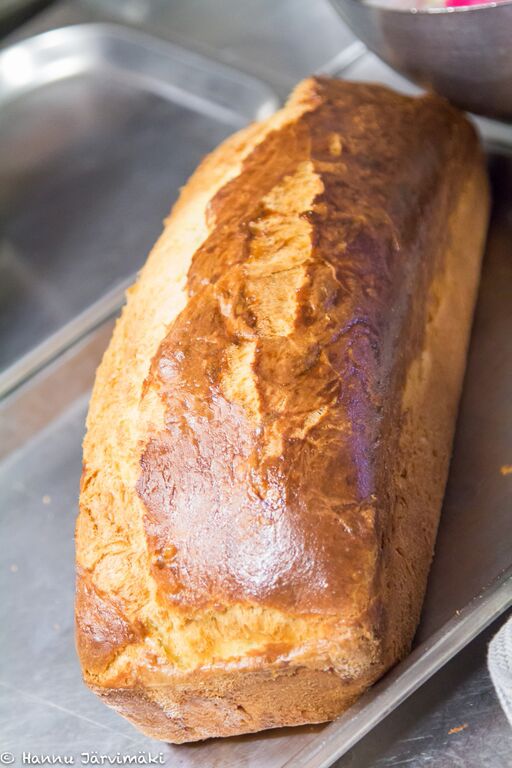 Alkuperäisessä reseptissä paistoajaksi annetaan 20-30 minuuttia, mutta tämä ei riittänyt niin kotona kuin Berthassakaan, vaan 40-45 minuuttia oli lähempänä totuutta. Irrota leivän reunat vuoasta varovaisesti veitsellä ennen kuin kumoat leivän pois.
