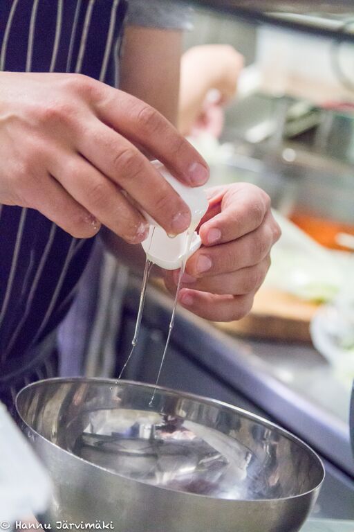 1. Erottele ensin keltuaiset valkuaisista. Tämä sujuu helpoiten, kun rikot munan kahtia ja kaatelet sitä vuorotellen kuorenpuolikkaasta toiseen. Pidä alla kippoa, johon valkuainen valuu itsekseen kaatelun aikana. Kun kuoressa on jäljellä enää keltuainen, kaada se omaan astiaansa. Anna keltuaisten lämmetä hetki huoneenlämmössä.