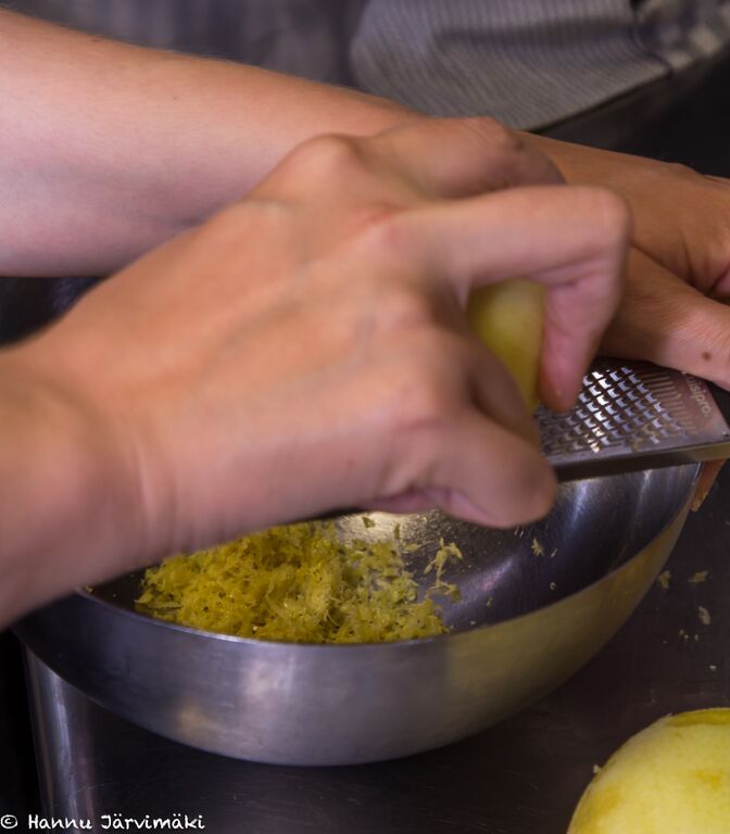 3. Mausta majoneesi suolalla, sokerilla, valkopippurilla, kaprissilpulla ja sitruunankuorella. Maistele. Majoneesi saa olla todella voimakasta, sillä maut tasaantuvat kylmässä. Anna majoneesin tekeytyä jääkaapissa pari tuntia ennen tarjoilua.