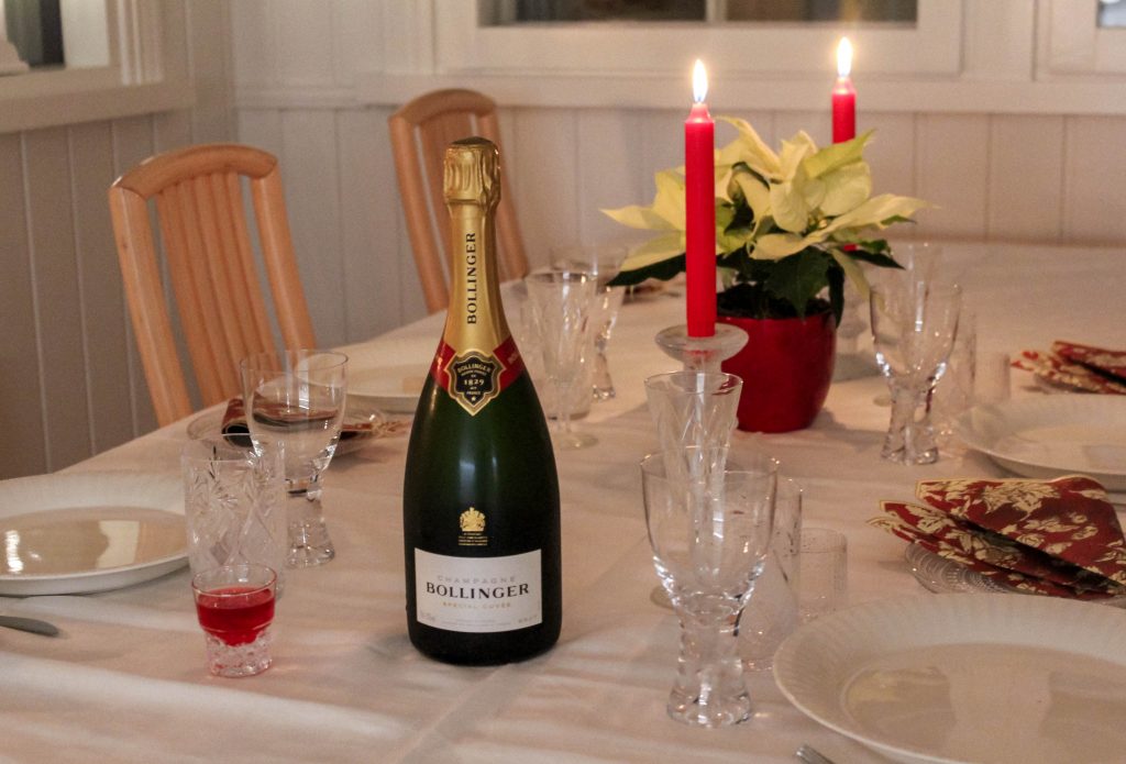 Olemme useampana vuotena juoneet läpi jouluaterian samppanjaa. Se sopii suht hyvin runsaaseen buffetiin, jossa on paljon vahvoja makuja, rasvaa ja suolaa. Tosin viimevuotinen, vähän makeampi Taittingerin Millennium mätsäsi jouluruokiin paremmin kuin tammisempi Bollinger, joka jäi nyt ruokien rinnalla suppeahkoksi. Rutikuiva ei ole aina paras vaihtoehto.