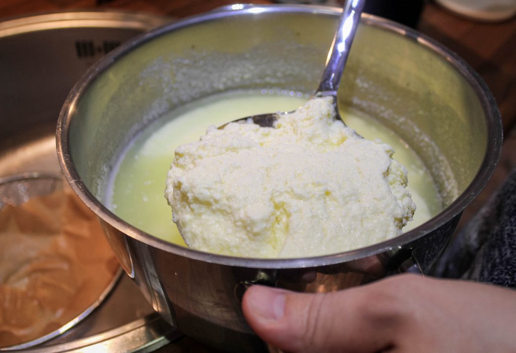 Tässä vielä varmuuden vuoksi kuvia, jotka havainnollistavat prosessia. Ensimmäisessä kuvassa kahteen kertaan kiehautettu juustomassa on seissyt puoli tuntia ja juusto on alkanut erottua herasta. Hera on siis tuota nestettä, juustomassa munakokkelin näköistä hyhmää.