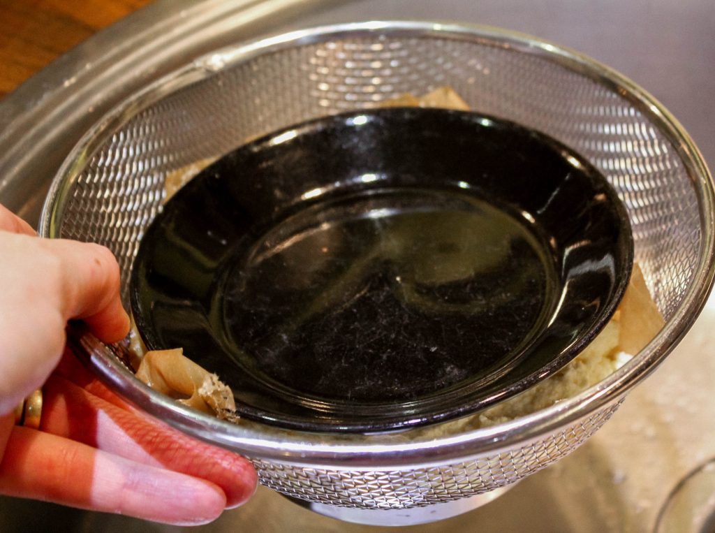 Kolmannessa kuvassa juustomassa on nosteltu kerroksittain siivilään ja kerrosten väliin on ripoteltu hieman suolaa. Massaa on paineltu lusikalla tiiviiksi ja sen päälle on laitettu lautanen painoksi. Laitoimme tämän viritelmän suureen kippoon. Yön aikana loputkin herat valuivat siivilästä kipon pohjalle.