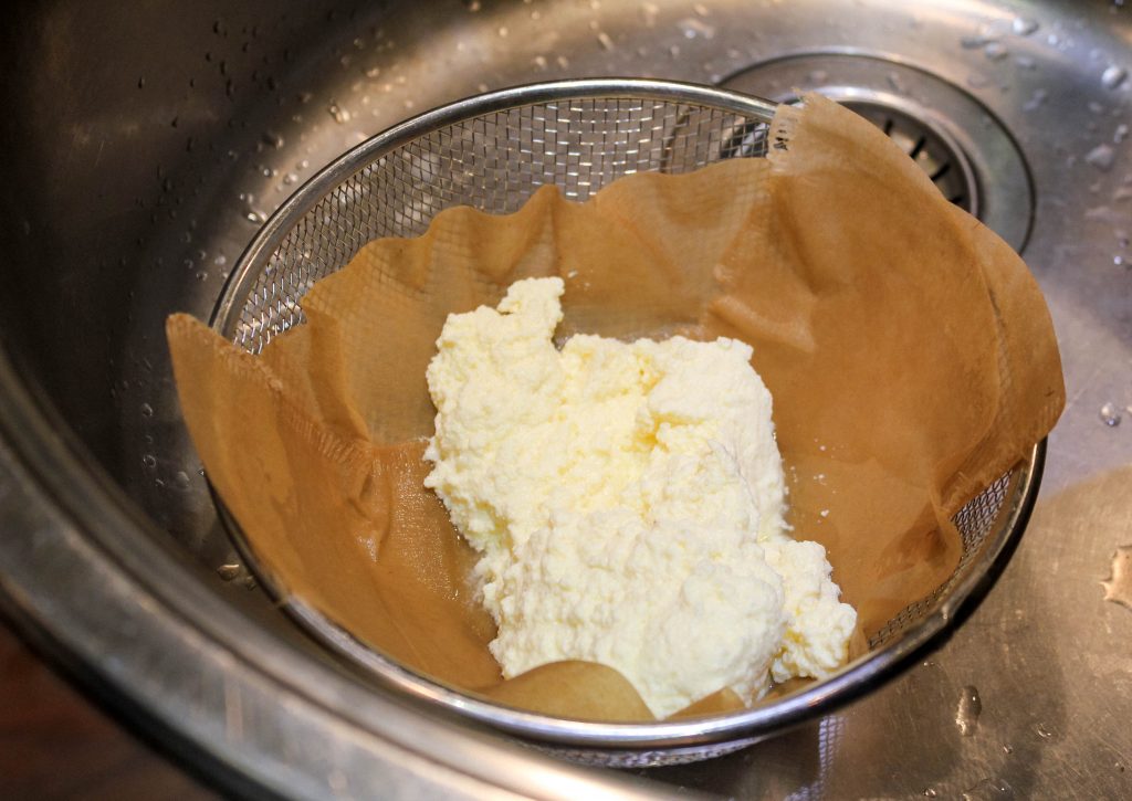 Toisessa kuvassa nostelemme juustoa suodatinpaperilla vuorattuun siivilään. Kattilaan jäävää heraa ei tarvitse kaataa viemäriin. Sen voi käyttää leivonnassa ja heran voi pakastaa.