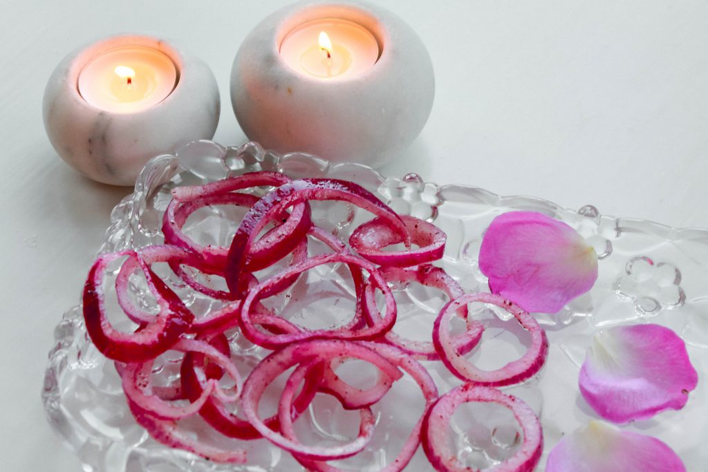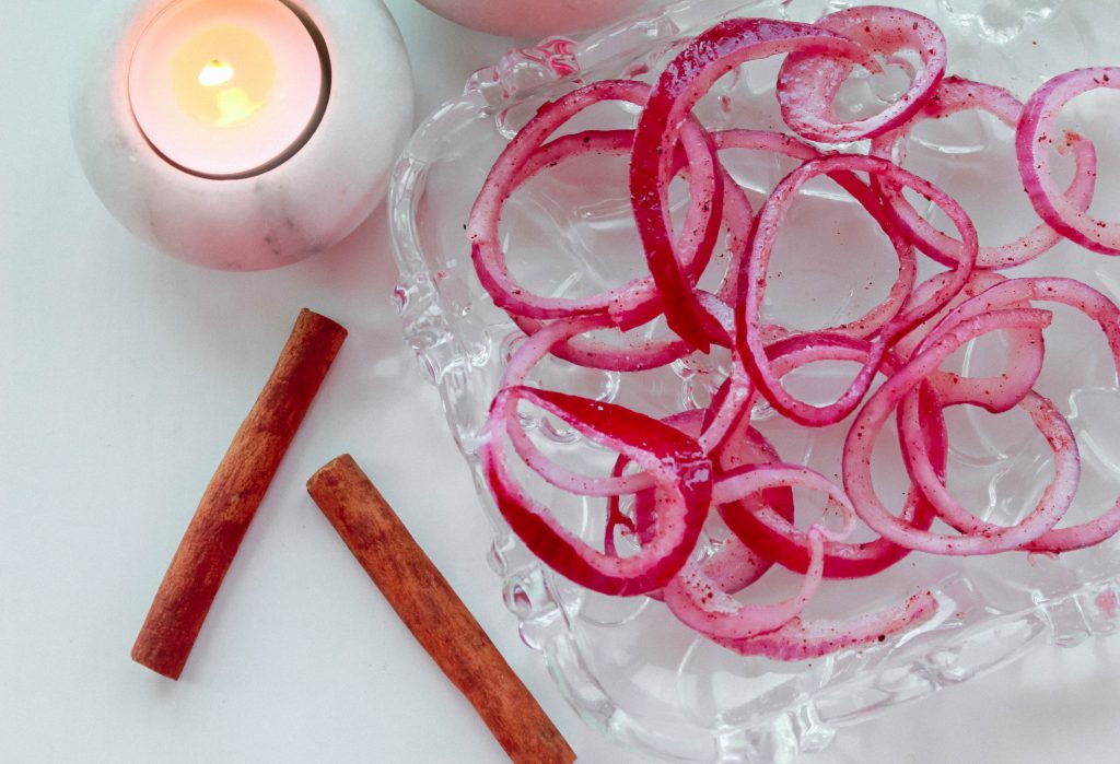 Kanelimarinoitu punasipuli sopii esimerkiksi buffetiin, jossa on myös marokkolaistyylistä kukkakaaliriisiä. Tästä reseptistä tuli puolivahingossa myös vegaaninen. Resepti on ollut tosi suosittu ja se on hyvä osoitus siitä, miten kaunista ja herkullista kasvisruoka voi parhaimmillaan olla.