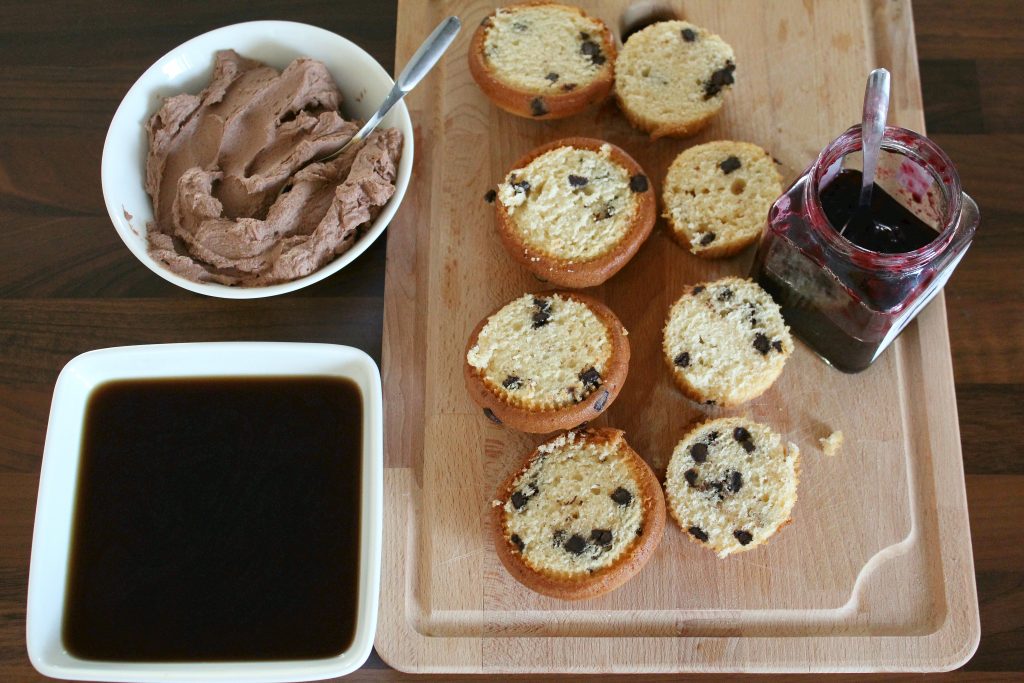 - Halkaise muffinssit kahtia pohja- ja hattuosaan. Kostuta molemmat puolikkaat kevyesti kahvilla tai kaakaolla. Puoli teelusikallista nestettä per puolikas riittää. Jos haluat siirtää muffinsit kauniimpiin paperivuokiin, tee se tässä vaiheessa.