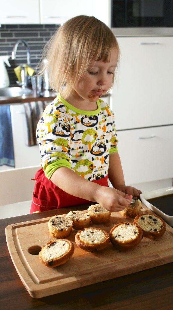 Päätin siis tehdä väsyneen kokin kompromissin, äärettömän helpon suklaakakun. Ostin paketillisen muffinsseja, halkaisin ja kostutin ne, levitin pohjien päälle boysenmarjahilloa ja suklaavaahtoa, hattu päälle, vielä toinen vaahtokerros ja strösseleitä. Tadaa, minisuklaakakut, siis överileivokset olivat valmiita, pikkukokki mielissään ja päivänsankari iloinen!