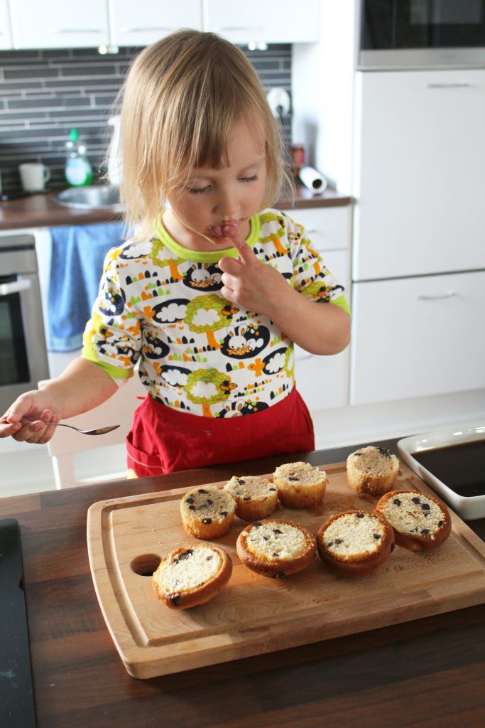 Lopputulos oli itse asiassa niin maukas, että aion tehdä näitä toistekin. Muffinssikakuista saa näyttäviä, jos täytteen pursottaa spiraaleiksi päälle. Nyt annoin kuitenkin lapsen tehdä kaiken itse, se oli hänelle niin tärkeää. Kakkuset ovat käsin tehdyn näköisiä, ja mielestäni se on tässä tapauksessa vain hyvä juttu. Kakut maistuvat vielä paremmilta, kun pulleiden tassujen jäljen näkee.