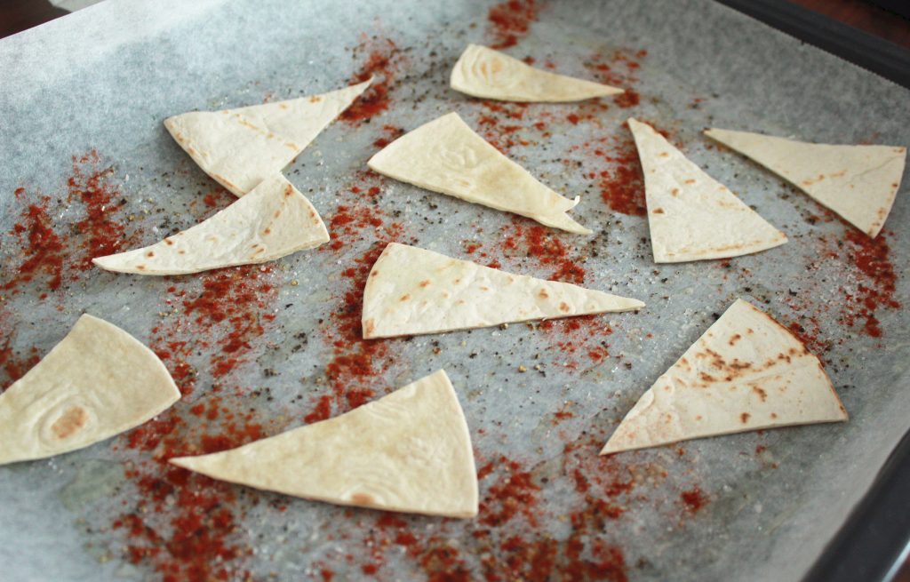 - Leikkaa tortillaletut saksilla tai veitsellä pieniksi kolmioiksi. Leikkaa lettu esimerkiksi neljään osaan ja jokainen neljännes kolmeen osaan.