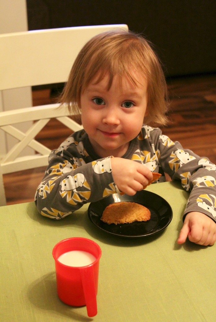 En ole suuri pullafani. Syön mielelläni yhden uunituoreen pullan tai korvapuustin kahvin tai maidon kanssa. Siihen se sitten jää. Yön yli levännyt pulla houkuttelee yhtä paljon kuin villatumpun pureskelu. Lupasin kuitenkin likalle, että leivomme jotakin, koska onhan tuommoisen pienen hääräilyä ihana katsella. Ja leipomisen tuoksu kotona, ah. Siitä pidän koko puuhassa ehkä eniten.