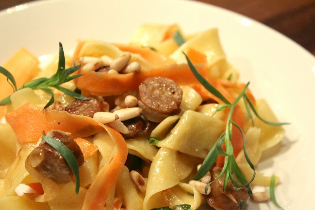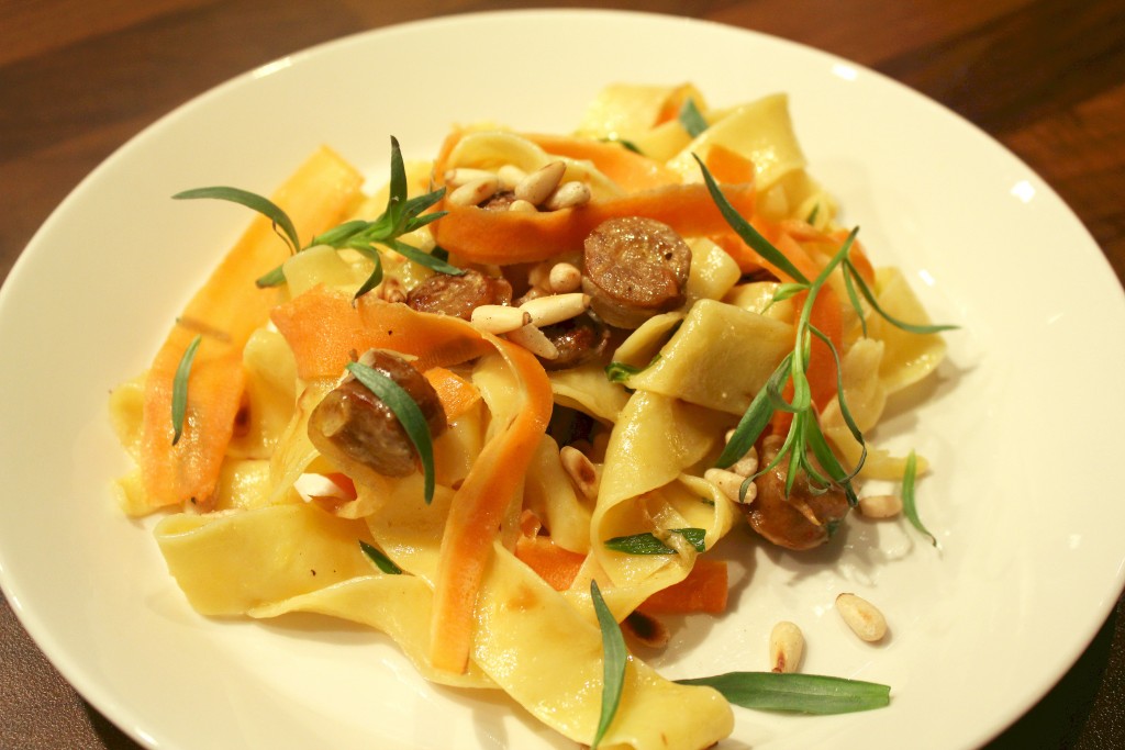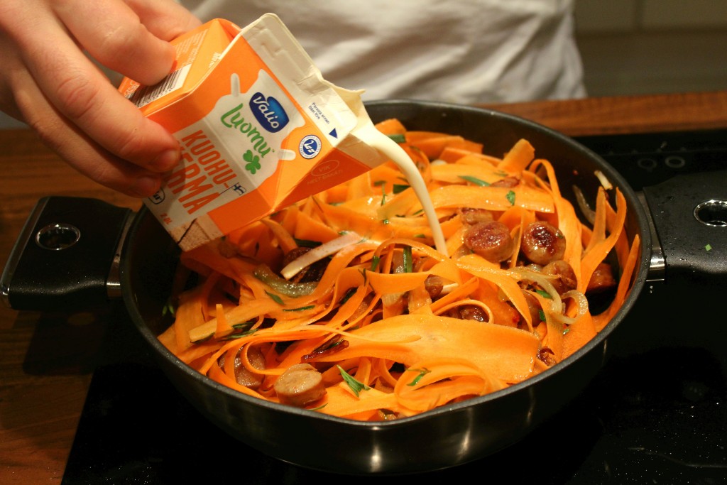 Käytin lammasmakkaraa, mutta voit korvata sen vaalealla bratwurstilla tai vastaavalla. Jos haluat tehdä vegeversion, kokeile makkaran sijaan kylmäsavutofua. Käytin paksua nauhapastaa ja vuolin porkkanat kuorimaveitsellä pastamaisiksi suikaleiksi.