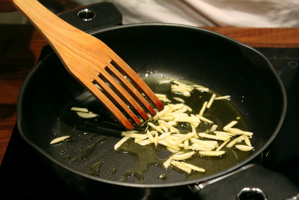- Paahda ensin pinjansiemenet valmiiksi. Kuumenna pannu, kaada siemenet pannulle ja paahda ne nopeasti sekoitellen. Varo, sillä pinjansiement palavat herkästi. Siirrä siemenet jäähtymään.