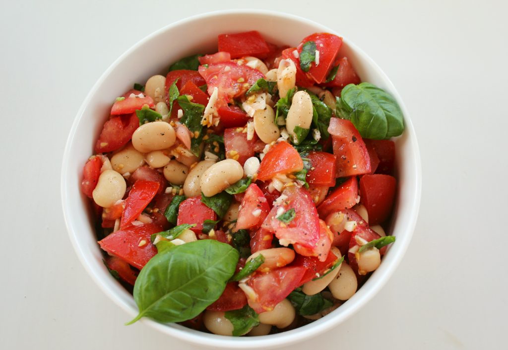 - Tee ensin tomaattisalsa. Pese tomaatit kuumalla vedellä. Lohko ne reiluiksi paloiksi ja poista kannat. Kuori ja murskaa valkosipulinkynnet. Huuhtele pavut siivilässä. Sekoita tomaatit, valkosipuli ja pavut suureen kulhoon. Revi joukkoon reilusti basilikaa. Mausta seos valkoviinietikalla, mustapippurilla, sokerilla ja suolalla. Voit käyttää sokeria lähes yhtä paljon kuin suolaa, sillä se taittaa happoja ja syventää salsan makuja.