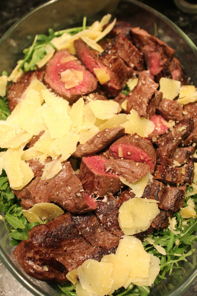 Pane rucola tasaisesti tarjoiluastiaan ja raasta rucolan päälle juustoa. Pane liha rucolan päälle, sirottele pinnalle sormisuolaa, pippuria ja lisää juustoa. Tarjoile heti. Niin yksinkertaista, niin hyvää.